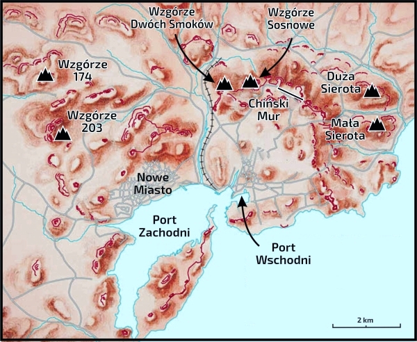 Po analizie map generał Nogi zdecydował, że kluczem do otwarcia twierdzy jest przejęcie wzgórz Duża Sierota i Mała Sierota. Japończycy mogli z nich ostrzeliwać rosyjskie reduty położone bliżej portu.