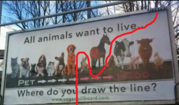 Ilustracja powyżej doczekała się kilku zabawnych przeróbek. Ta z nich, która miała największą wartość dla kwestii hierarchii traktowania „istot niższych”, pokazywała, że moralność podlega płynnej regulacji i relatywizacji przez bardzo specyficzną okoliczność – dostęp do protein. To ten nieusuwalny z życia fakt sprawił, że dowcipniś-realista naruszył powagę przesłania wegańskiego plakatu i narysował kilka granicznych linii, które on sam przekracza lub nie, zależnie od kwestii dostępu do żywności z innych źródeł. W sytuacji pokoju po stronie „zwierząt towarzyszących” pozostawiał psy, koty i inne oczywiste w naszej kulturze gatunki. Jedzeniem były kury, krowy i świnie. W sytuacji wojny i głodu („załamania gospodarczego”) na stronę spożywczą przeszły konie i króliki. W sytuacji katastrofy cywilizacyjnej na rożen poszło już wszystko, co się dało dogonić i złapać – nie tylko szczury, ale koty, psy i rybki akwariowe5.