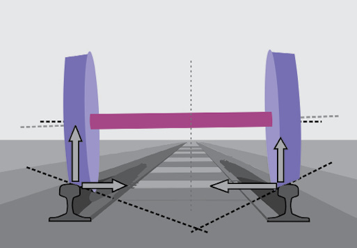Przykładem implementacji identycznego mechanizmu sprzężenia zwrotnego, które stabilizuje system, jest kształt kół w pociągach. Są one stożkowe, dzięki czemu pociąg ma naturalną tendencję do wygaszania pochyleń na bok. Na ilustracji poniżej, w chwili przechyłu na prawo wypadkowa sił sprawia, że przechył sam się redukuje.